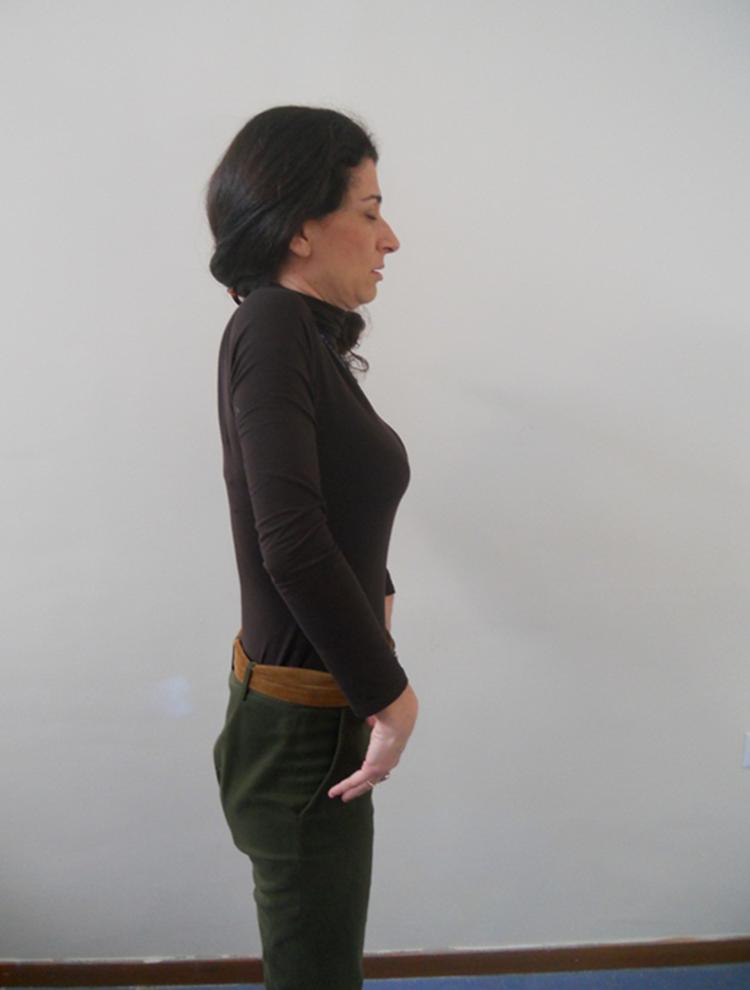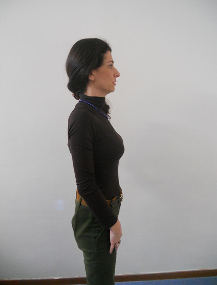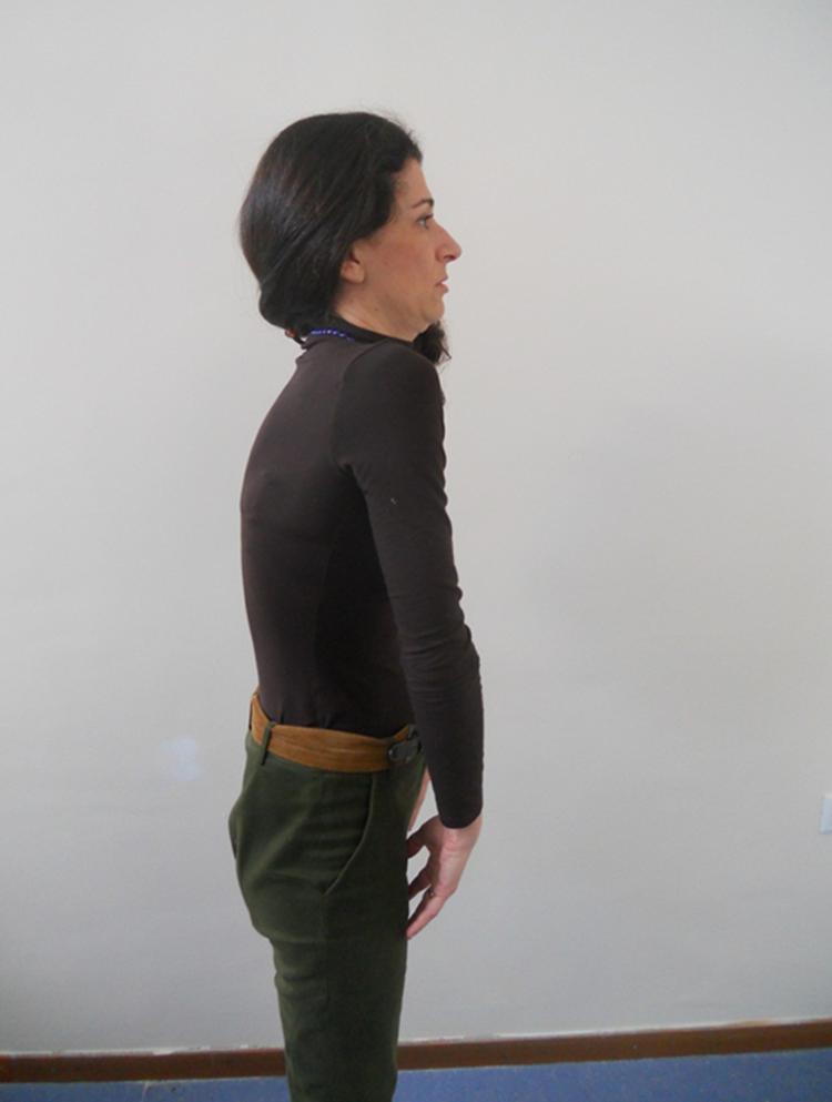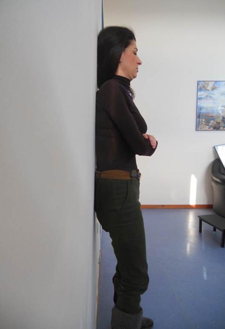 5. Flessione sinistra-destra: toccare sempre il muro con la metà della testa, restando in questa posizione, con depressione della spalla opposta. Non dimenticare di mantenere la posizione di inclinazione del bacino e le spalle contro il muro.