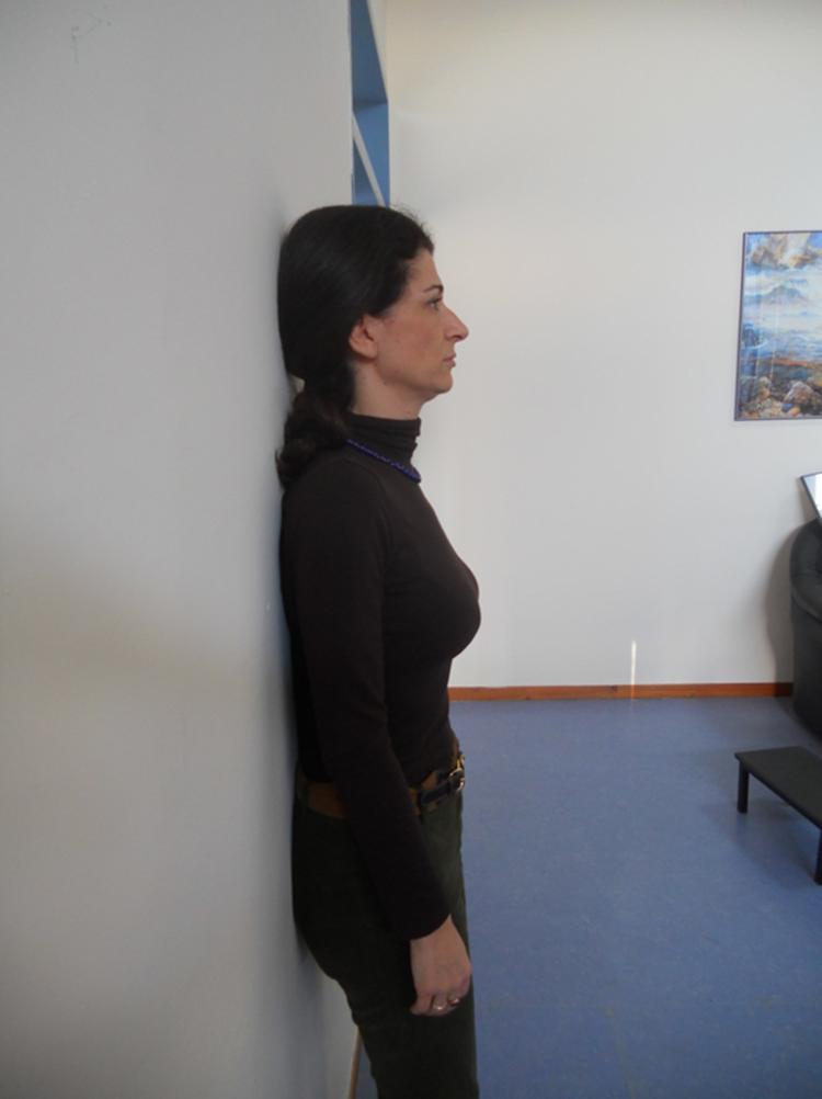 1. I soggetti devono arrivare a una posizione di inclinazione del bacino per eliminare l’estensione lombare e tenerlo in posizione per 10 secondi. La colonna lombare dovrebbe essere piatta e in contatto al muro.