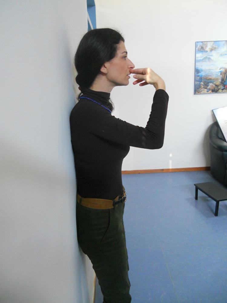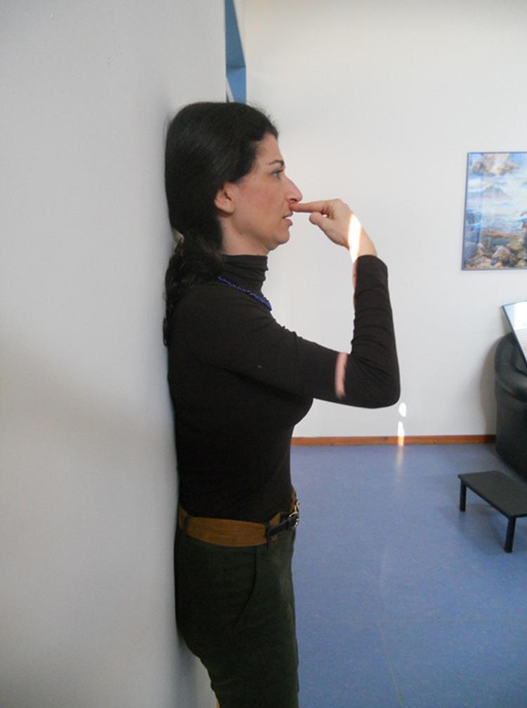 1. Contro un muro, iniziare i movimenti del collo in tutte le direzioni (flessione, estensione, rotazioni sinistra e destra e flessione laterale), mentre si tengono continuamente le scapole addotte (il muro aiuterà a mantenere la giusta posizione della scapola). Occorre svolgere lentamente i movimenti che necessitano il massimo R.O.M. Posizionare poi l’indice e il medio sulla parte superiore del labbro come guida, per spostare la testa indietro in una posizione retratta.