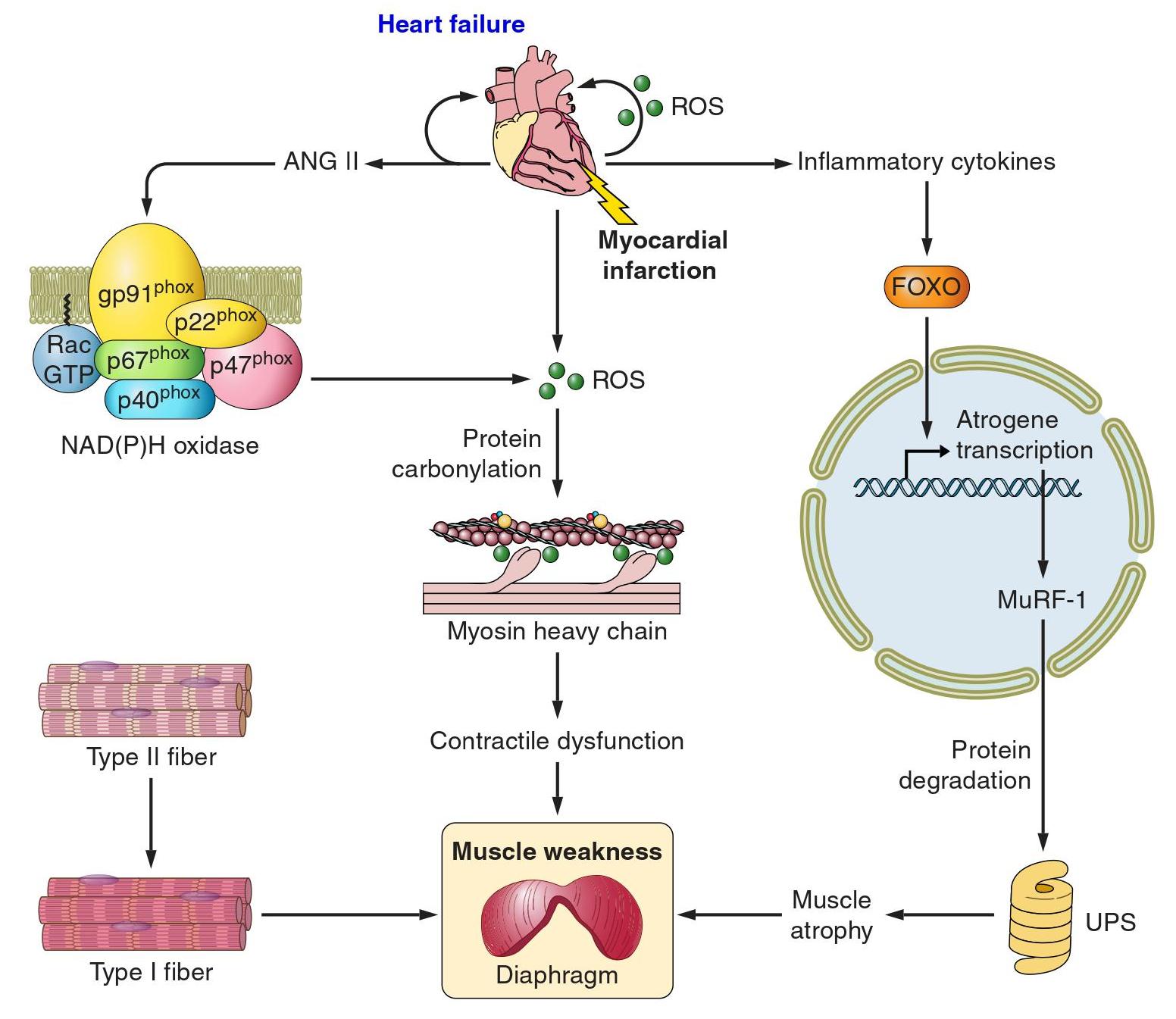 La perdita della massa muscolare scheletrica contribuisce direttamente all’intolleranza nello svolgimento delle attività quotidiane, il quale è un forte predittore di qualità della vita e mortalità. La perdita muscolare è principalmente guidato dal sistema ubiquitina-proteasoma (UPS), autofagia e segnalazione mediata dalla miostatina.