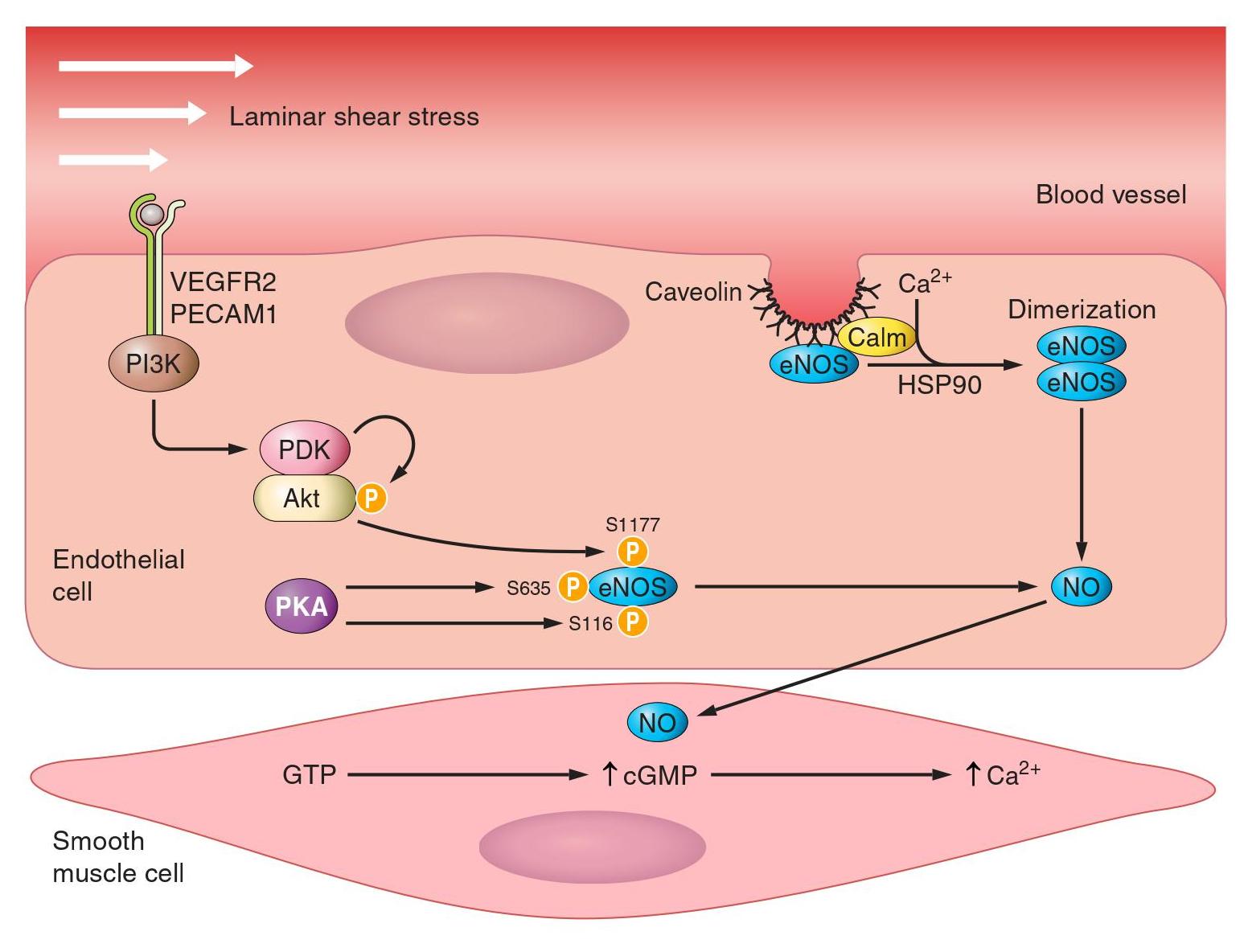 La produzione di ossido nitrico (NO), il principale fattore di regolazione della vasodilatazione, è mediato dall’ossido nitrico sintasi endoteliale (eNOS). L’attivazione di eNOS si basa su un’attivazione a più fasi. Il primo passo è l’attivazione è Ca2+ dipendente. L’entrata di Ca2+ nella cellula e la sua interazione con la calmodulina, innesca il rilascio di eNOS dalle membrane plasmatiche, dove è collegato e inattivo. In un secondo momento, l’eNOS si associa con proteine da shock termico (Hsp90), portando così alla dimerizzazione dell’enzima che produce l’osido nitrico. All’aumentare dello stress da taglio nei vasi, in seguito all’esercizio fisico, la cascata di segnalazione viene avviata dall’attivazione di recettori meccanici, come il recettore VEGF2 o molecola di adesione delle cellule endoteliali piastriniche 1 (PECAM1), seguito dalla fosfatidilinositolo 3-chinasi (PI3K). Un altro percorso di attivazione di eNOS mediato dallo stress da taglio, avviene tramite integrine, le quali collegano la matrice extracellulare con la rete di actina. Le integrine interagiscono con diverse molecole coinvolte nella segnalazione, come ad esempio l’adesione focale chinasi (FAK).