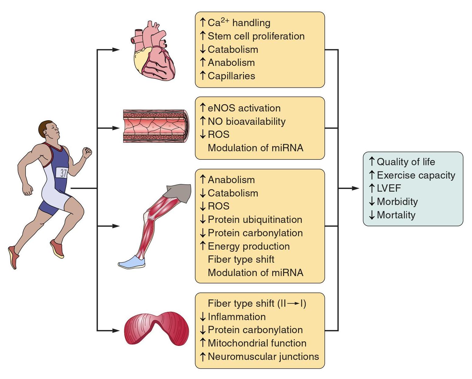 Rimane il fatto che, in una meta-analisi recentemente pubblicata, che include 15 randomizzati studi controllati condotti su 813 soggetti, hanno concluso che l’allenamento aerobico continuo, inverte il rimodellamento ventricolare sinistro e migliora la frazione di eiezione ventricolare sinistra (LVEF), volume telediastolico e volume sistolico terminale. Oltre agli effetti noti dell’esercizio sul sistema neuro-ormonale, sono importanti anche altri 3 meccanismi: la modulazione del sistema catabolico / anabolico, alterazioni nella gestione del Ca2+, e la modulazione della proliferazione delle cellule staminali. Durante gli ultimi anni, si è arrivati a comprendere alcuni cambiamenti molecolari, responsabili dell’intolleranza all’esercizio in soggetti con insufficienza cardiaca, ed è evidente che l’esercizio fisico, apporta il suo effetto benefico in un modo multifattoriale.