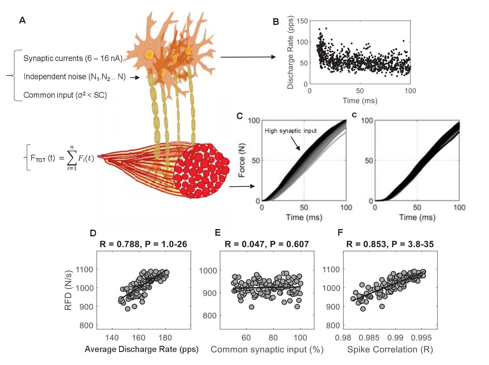 L’aumento della velocità di scarica modula la sincronizzazione delle unità motorie in modo dipendente dall’ingresso. Le associazioni significative tra le correlazioni degli spike e il tasso di sviluppo della forza erano un sottoprodotto dell’influenza della velocità di scarico (Figure di seguito). I determinanti del tasso di sviluppo della forza sarebbero quindi gli alti input sinaptici dalla corteccia e / o le proprietà intrinseche dei motoneuroni.