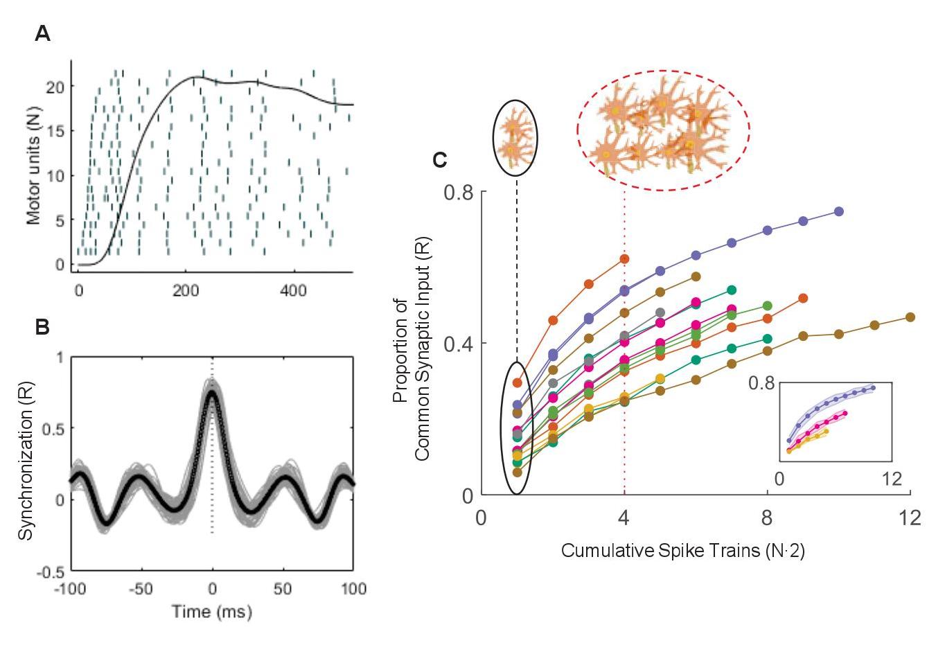 Il significato funzionale della sincronizzazione durante i movimenti dinamici non è chiaro. Un certo grado di input comune tra i motoneuroni è una necessaria strategia neurale per controllare la forza muscolare. Il livello di correlazione dipende da molti fattori, oltre alla forza relativa dell’input comune, inclusi i tassi di scarica dell’unità motoria e le proprietà intrinseche del motoneurone. I modelli di unità motorie mostrano che il picco di sviluppo della forza nelle singole unità motorie è determinato principalmente dalle loro velocità di scarica. I determinanti del tasso di sviluppo della forza si basano quindi sulla spinta sinaptica verso il pool di motoneuroni e le proprietà intrinseche del motoneurone. Il numero di unità motorie reclutate durante contrazioni veloci è una misura indiretta della velocità con cui i motoneuroni superiori vengono reclutati dai circuiti corticali.