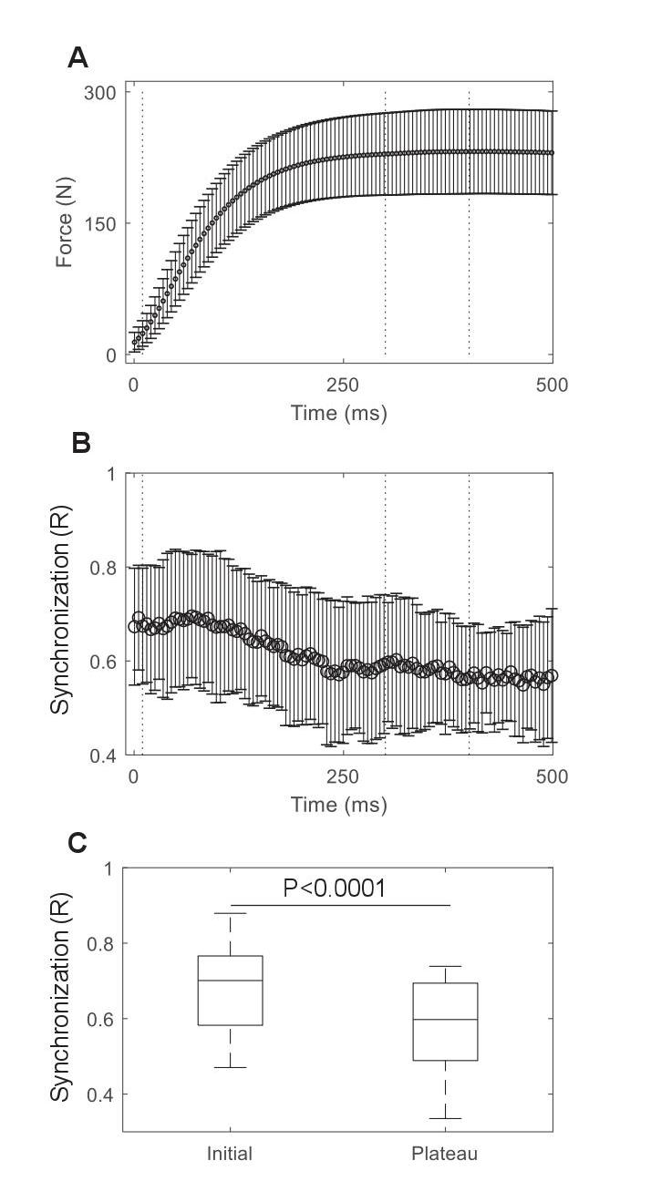 Molti hanno ipotizzato che una maggiore sincronizzazione delle unità motorie possa anche contribuire ad un aumento del tasso di sviluppo della forza e ai cambiamenti associati nella velocità di produzione della forza con l’allenamento. Anche se questa speculazione sembra intuitivamente corretta, nessuno studio ha sperimentalmente testato la correlazione nei tempi di picco delle unità motorie durante le contrazioni rapide. Recenti dati sperimentali e modelli di simulazione hanno infatti dimostrato che la correlazione tra i diversi tempi di scarica delle unità motorie dipende dalla velocità con cui scaricano. Pertanto, la sincronizzazione dell’unità motoria, potrebbe non avere di per sé, un impatto funzionale sulla generazione di forza. Il tasso di produzione di forza è principalmente associato al tasso di scarica dei motoneuroni. Sebbene la fase iniziale dell’aumento della forza muscolare, mostra una maggiore sincronizzazione delle unità motorie, la quale è correlata con il tasso di sviluppo della forza, questi risultati sono frutto dell’aumento del tasso di scarica dei motoneuroni. La correlazione significativa tra la sincronizzazione delle unità motorie e il tasso di sviluppo della forza è stata giustificata dall’influenza della velocità di scarica