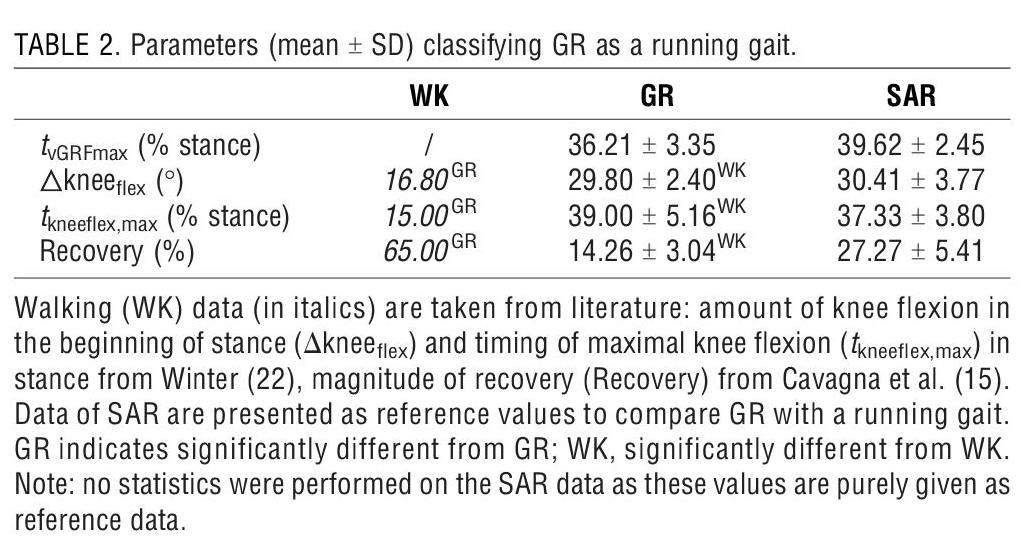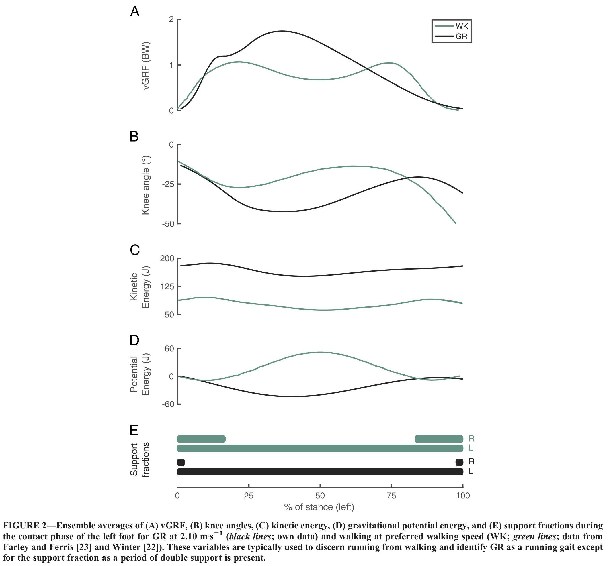 Sebbene in generale questi criteri coincidano, nella corsa lenta, spesso manca una fase di volo. Vereecke et al. suggeriscono che per distinguere questa diversa tecnica di corsa, venga usato il termine “corsa a terra” (GR), per identificare questo tipo di locomozione. Recenti osservazioni di Shorten e Pisciotta, hanno quantificato la prevalenza di questa corsa a terra, nelle maratone, rilevando che il 16% di tutti i partecipanti corrono con questa tecnica. Questa osservazione ha anche dimostrato che la corsa a terra (GR) si verifica principalmente quando le persone corrono lentamente. La corsa a terra GR, nonostante l’assenza di una fase di volo, ha una reazione di forza al suolo (GRF), con anche un leggero piegamento delle ginocchia. Rispetto alla corsa con una fase di volo, la corsa a terra, è caratterizzata da carico muscolo-scheletrico, velocità di carico inferiore (VILR) e accelerazioni tibiali (TA), le quali sono delle misure tipiche della corsa, utili per dimostrare l’intensità dell’impatto, registrando anche sforzi a bassa frequenza nella potenza eccentrica nella caviglia e negli estensori del ginocchio. La corsa a terra (GR), dovrebbe essere considerata come una corsa a tutti gli effetti, in quanto è un’andatura simmetrica in cui vi sono tre dei quattro criteri, comunemente usati per distinguere la camminata veloce o la marcia (Tabella 2, Fig. 2).