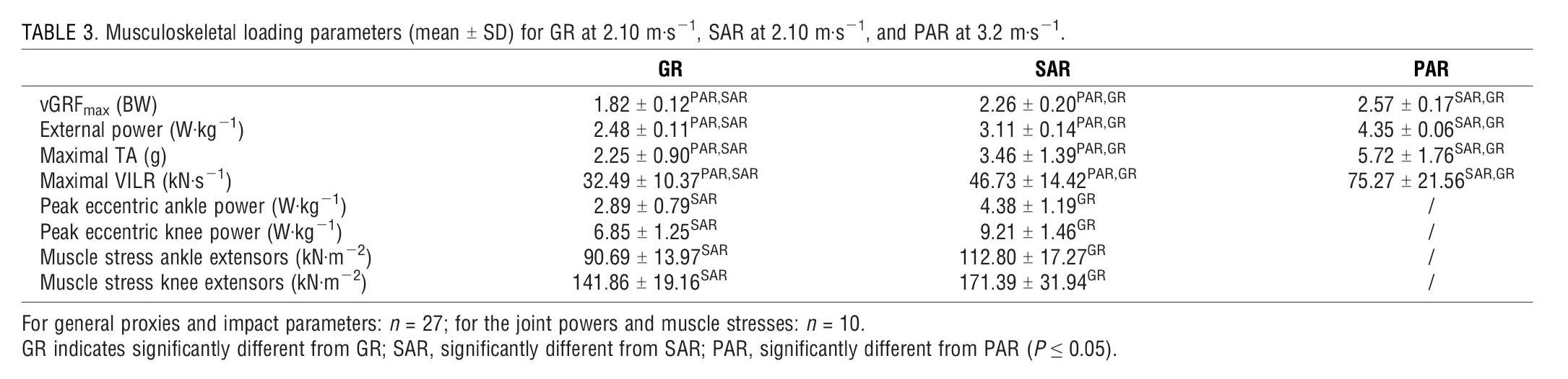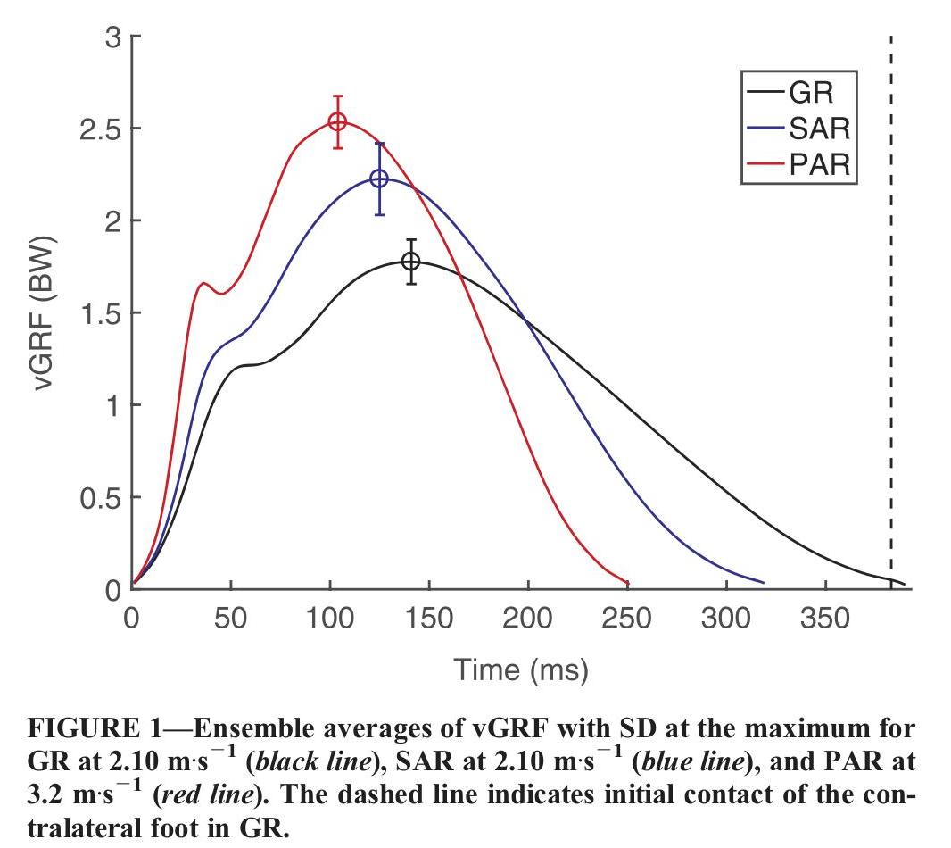 La modifica dello stile di corsa verso quella a terra (GR) a una velocità di 2,10 metri / s, ha due importanti conseguenze. La prima conseguenza riguarda il carico muscolo-scheletrico, inferiore di circa il 20% per GR, rispetto alla corsa con fase di volo, alla stessa bassa velocità (Tabella 3, Fig. 1). L’intensità dell’impatto al suolo, dipende dalla decelerazione improvvisa. Nella corsa a terra, le parti prossimali degli arti inferiori, subiranno meno la decelerazione, poiché l’impulso vGRF è più piccolo, rispetto al piede (Figura 1). Il momento verticale del piede e della parte inferiore della gamba, al primo contatto, e quindi alla seguente decelerazione, è più piccola, con un impatto minore rispetto alla corsa classica con fase aerea (Tabella 3). Un recente modello di Bertelsen e colleghi, propone che gli infortuni sulla corsa, si verificano quando la capacità di carico muscolo-scheletrico (ovvero la sostenibilità del carico), viene superato da dei sovraccarichi funzionali meccanici specifici sulle strutture esposte.